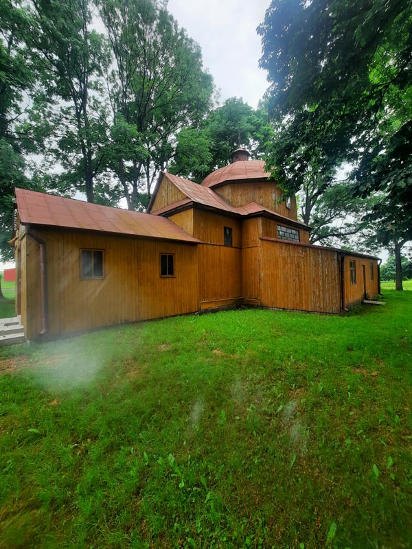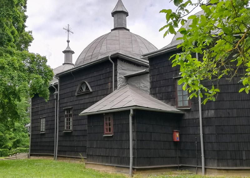 Dociramy do miejscowości o wdziecznej nazwie Liski, jest tu drewniana cerkiew do której trzeba się wspiąć po licznych schodach. Wśród starych drzew ciemne drewniane ściany dżwigają wielkie blaszane kopuły. To cerkiew pod wezwaniem św. Mikołaja z 1872.