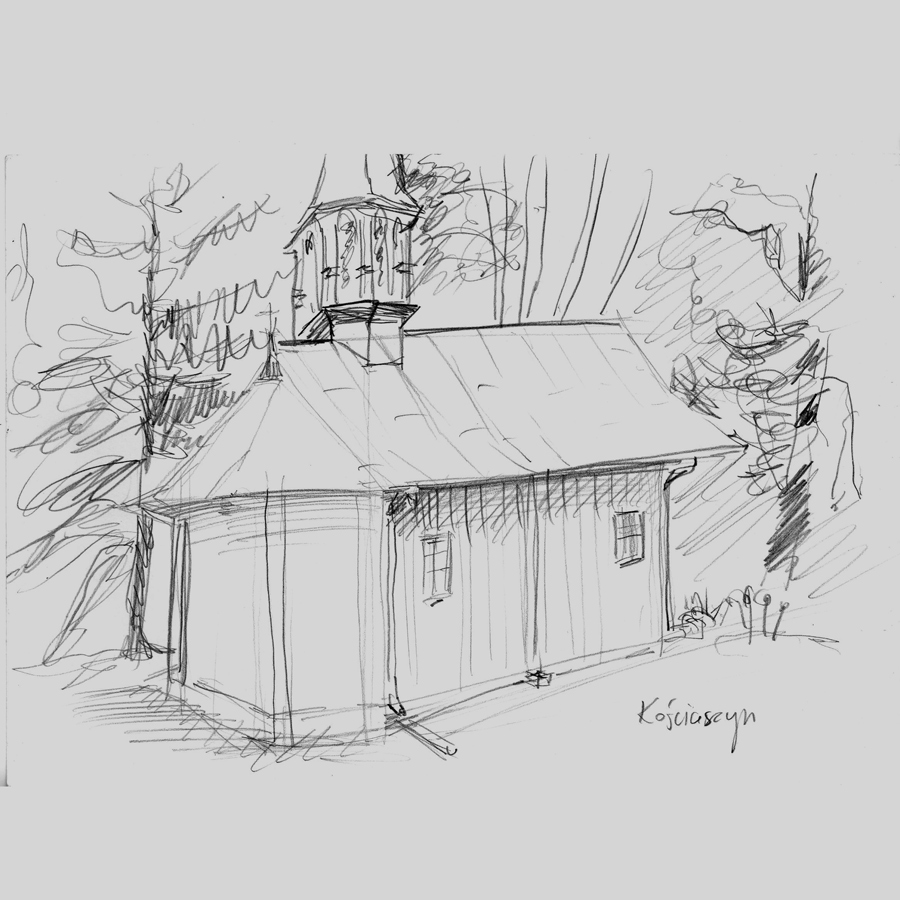 Kościaszyn to kaplica pełniaca rolę kosciła filialnego. Też na wzgórku tym razem niewielkiego I kilkoma schodkami. Prosty budynek, z absydą I przyozdobiony blaszanym chełmem. W ścianach kilka małych okienek, nie widzielismy wnetrza, ale musi być dość ciemne. Kaplica św. Jana Niepomucena z 1889 roku.