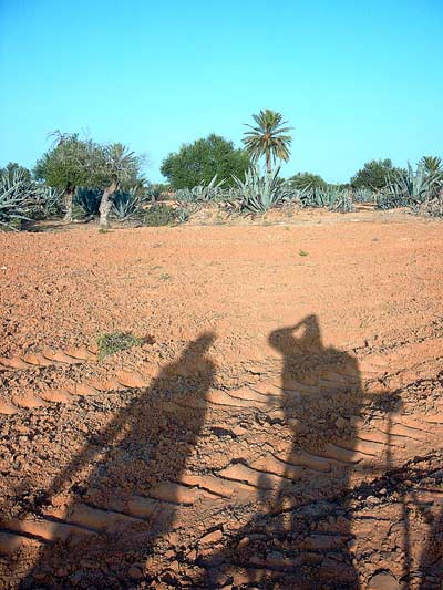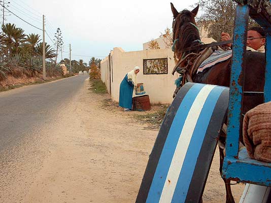 Tylko w hotelu Garden Park na autokar czekała z muzyką duża grupa animatorów, zaczęło się mile. Zaraz zanurzyłem się w basenie i pływając powtarzałem sobie, jest grudzień, jest grudzień. Trudno w to było uwierzyć. Wśród plażowań to nad basenami to nad morzem, dopada nas Ali. Ali jest przyjemnym gadułą, lecz aż oczy mu się błyszczą gdy omotuje klienta. Ali jest pośrednikiem od wycieczek dorożką, wierzchowcem, skuterem, wielbłądem, słoniem, nie słoniem, nie. Daliśmy się z wdziękiem i szybko omotać. Ali proponuje wycieczkę do Midoun, a tam zwiedzanie targu. Na słowo targ nas zmroziło nie chcemy być ciągani po straganach znajomków. Ustalamy wiec inny kierunek do Mahboubine, gdzie nie ma targu, ma to kosztować 40DT, ruszamy jutro. Teraz zaś Ali wziął się za wypisywanie biletu, wyciągnął bloczek i wypisuje pracowicie rubryki. Dopytujemy się po co nam ten bilet, a jego fatyga? Potrzebny. Rano Ali czeka, prowadzi nas do dorożkarza, przy dorożce dostaje kasę i zabiera bilet, pieniądze wkłada sobie do kieszeni, dorożkarzowi nie daje nic. Formalnościom staje się zadość, można ruszać. Zaraz zjeżdżamy z głównej drogi i robi się przyjemnie. Nieśpiesznie poruszamy się wśród pól, oliwek, palm, małych wiosek, pracujących ludzi. Dorożkarz małomówny, ciągle zaczepiany, w powrotnej drodze się rozkręca. Pod koniec całkiem już nabiera do nas zaufania.