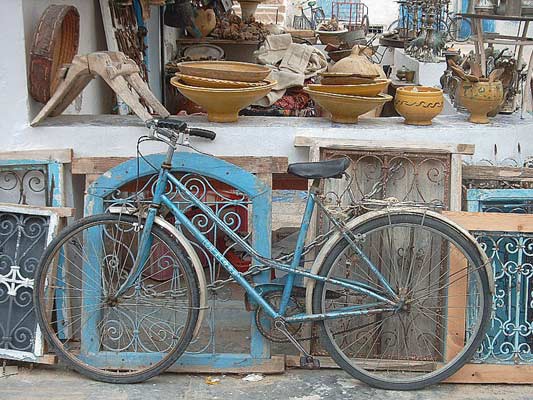 Korzystając ze zdobytej wiedzy topograficznej i z faktu, że do Mahboubine da się dojechać wśród pól, bierzemy hotelowe rowery. Polne drogi okazują się wygodne do jeżdżenia, mają twarda zbitą powierzchnię. Cała wyspa jest płaska, nie ma więc męczących podjazdów. Ze zaś w najszerszym miejscu nie ma więcej jak 30 km, jest świetna do rowerowych wycieczek. Skoro już dojechaliśmy do miasta Mahboubine, robimy zakupy w miejscowym sklepie. Słodkie kandyzowane owoce i śmiertelnie ostrą papryczkę w zalewie, mleko dla hotelowych kotów, arabskie chlebki, puszki hałwy. Oglądamy wszystko i każemy sobie pokazywać, powoli ustawia się za nami kolejka, która wraz ze sprzedawcą ma najlepszą zabawę z takich co to oglądają zwykle towary i się wszystkiemu dziwią.