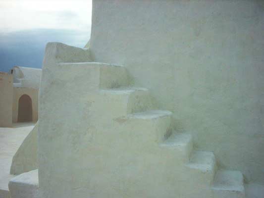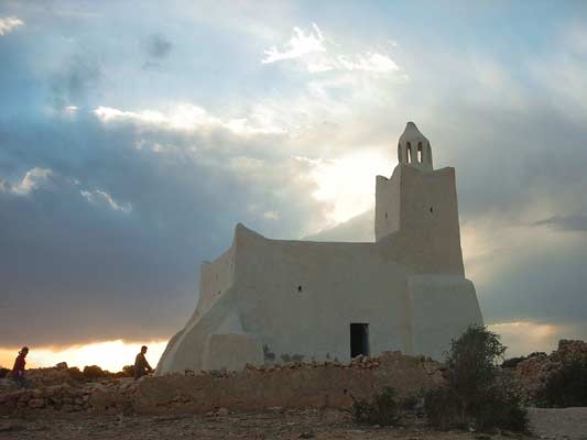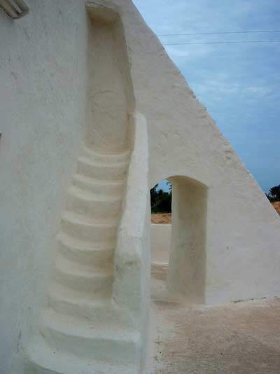 Stolicą Djerby jest Houmt Souk, nie wypadało nam jej pominąć. Dostaliśmy się tam prosto, taksówką, które tam są dość tanie. Kosztowała by 6 DT ale nasza droga nie jest ta najprostsza, Po drodze chcemy zajrzeć do małego meczetu w Ghizen, tam bo znależliśmy zdjęcia na jakiejś stronie WWW przed wyjazdem. Po drodze widzimy inny piękny meczet w Kazroune, dlaczego nie mielibyśmy zajrzeć i tu. Przy poprzedniej wizycie w Tunezji zwiedzaliśmy już meczety. Były to wielkie i sławne meczety, tu na Djerbie odkryliśmy inne, małe, skromne ale pełne uroku. Udało nam się też wejść do środka, ba nawet na wiezę. Na wieżę wejść to nic, gorzej było zejść. Schodki na nie prowadzące nie miały żadnej regularności mogły być wysokie na 10, bądź na 50 cm i ustawione pod różnymi kątami. Wchodząc miałem je oświetlone światłem z góry, ale schodząc wypełniłem sobą całą ich szerokość, zapanowały egipskie ciemności, choć to Tunezja. Najwyraźniej przeciętny mezuin jest drobniejszej postury. Te wygładzone ściany na zdjęciach, na klatce schodowej budowniczowie troszkę sobie odpuścili. Byłem zaklinowany w tych szorstkich, ciasnych ścianach. Doszedłem do wniosku, że ja tu nie jestem w stanie upaść, bo bardziej wiszę w powietrzu jak stoję, to pozwoliło mi ruszyć do przodu w ciemną czeluść. Przewodnikami naszymi byli 2x taksówkarze, raz chłopak który takim oprowadzaniem się trudnił. Wiele się dowiedzieliśmy o funkcjonowaniu meczetu, obyczajach, każdej osobie udało się coś wnieść interesującego di tej opowieści. Jedna rzecz jednak pozostaje dla mnie niejasna, choć o to pytałem to mam wrażenie że nie dostałem prawdziwej odpowiedzi. Schody które nigdzie nie prowadziły i nagle się urywały, badź wręcz kończyły ścianą. Dostawałem odpowiedź, że to były schody kiedyś na wieżę, a że teraz jest głośnik i już na wieżę się nie wchodzi. Przecież na wieżę wchodziłem od wewnątrz meczetu a te tajemnicze schody były na zewnątrz?!? Czy to jakiś symbol o którym niewiernym zgodnie się milczy?